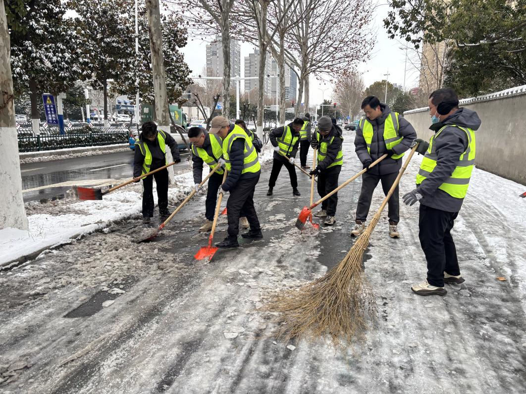 降雪當(dāng)晚,公司領(lǐng)導(dǎo)率先垂范,連夜趕赴上級公司參與統(tǒng)一組織的除雪行動,帶頭沖鋒在清雪一線;同步組織工作人員對公司門口及周邊重點路段有序拋撒融雪鹽,防范路面結(jié)冰打滑,守護夜間行人與車輛出行安全。1月20日上午,公司第一時間組織干部職工分兩批次前往四海天橋、工行小區(qū),大家手持鐵锨、掃帚、推雪板,分工協(xié)作鏟積雪、清死角、通路面,高效完成兩處區(qū)域清雪任務(wù),保障道路順暢通行;1月20日下午,公司積極響應(yīng)市級部署,集結(jié)20名骨干力量奔赴淮舜路鐵路立交橋北頭至陳洞路立交橋路段,集中清除北側(cè)非機動車道積雪積冰,助力城市道路恢復(fù)通行秩序。